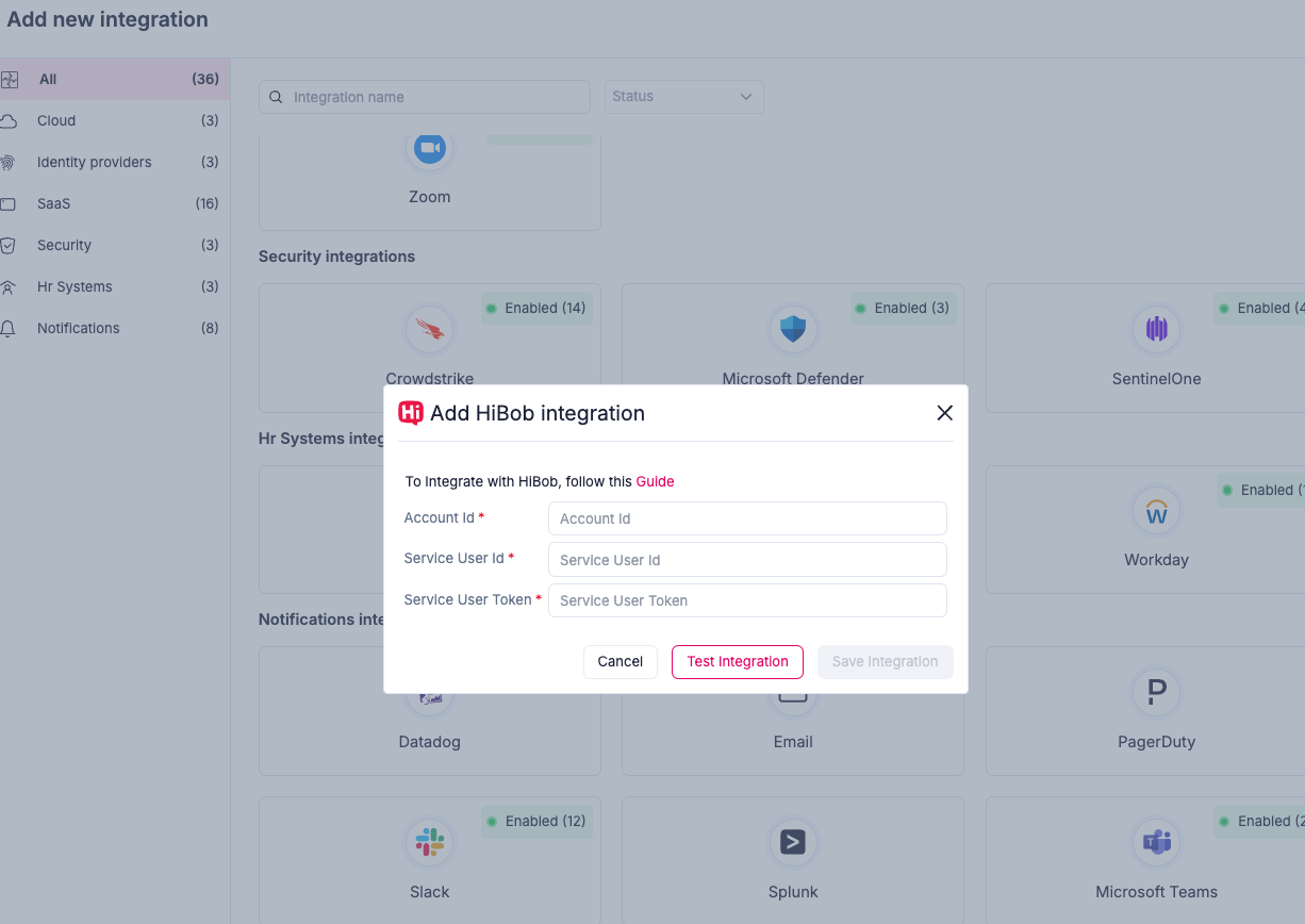 In the integrations page, select HiBob and add a new integration. fill in the created credentials and submit.&#x20;