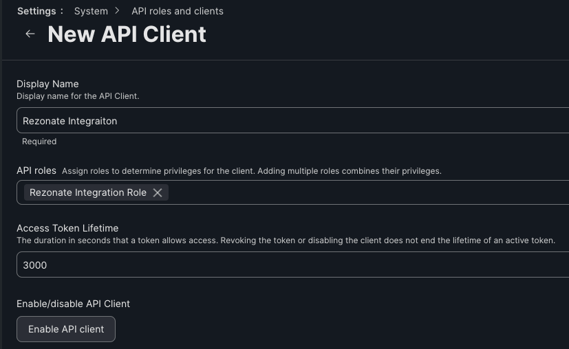 5. In the API roles section, select the new “Rezonate Integration Role”
