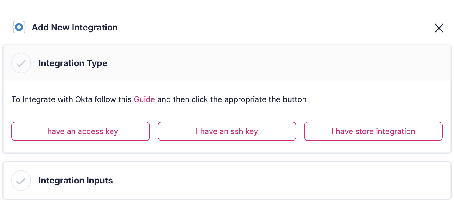 6. Fill out the form, entering your okta domain and then clicking "I have store integration", and fill in the client-id and secret key you collected in step number 2.<br>