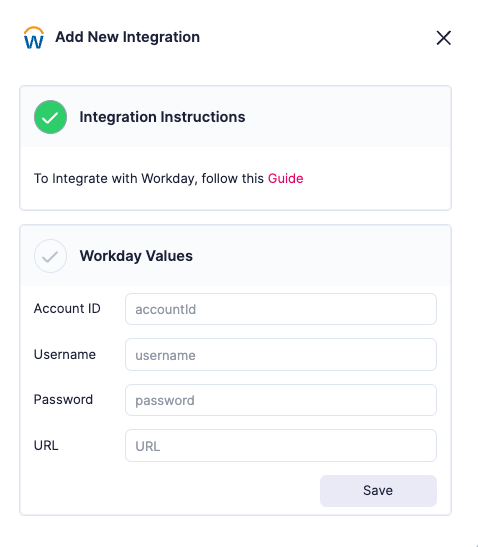 <table><thead><tr><th width="254">Key</th><th>Info</th></tr></thead><tbody><tr><td>Account ID</td><td>Any preferred name for the integrated account:<br>Example: workday</td></tr><tr><td>Username</td><td>The username that has access to the recently created report</td></tr><tr><td>Password</td><td>The password for that username</td></tr><tr><td>URL</td><td>The url to the recently created report</td></tr></tbody></table>