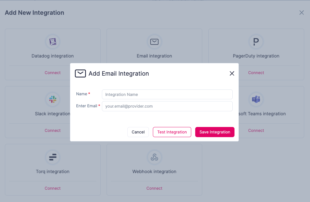 Note that before saving the integration, you can click on **Test Integration** which will send an example message to the target email.