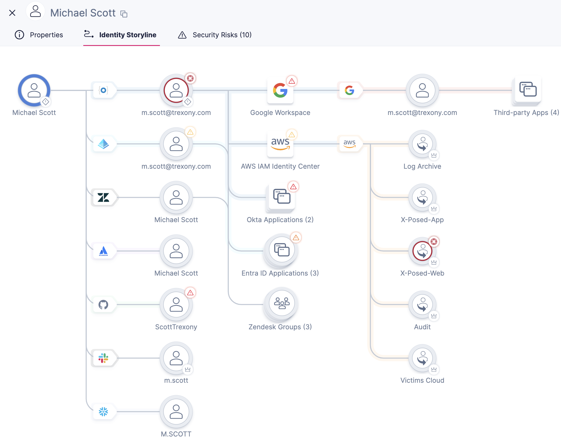 <mark style="color:purple;">**Identity Storyline -**</mark> A Visual Representation that describes the access that the identity has to the environment, taking into consideration federated access, and tenant configurations. \